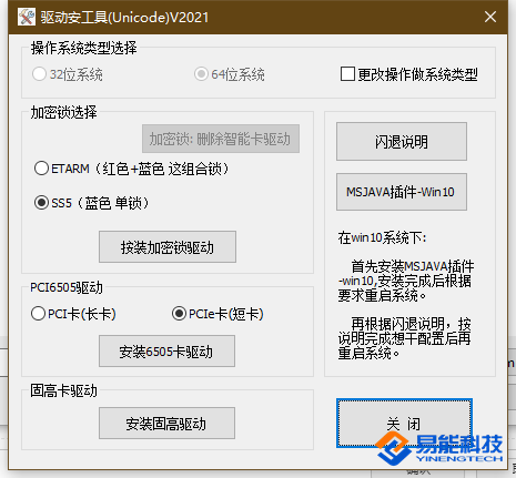 根据机型及相关配置依次选择相对应的加密狗驱动、6505卡驱动、固高卡驱动逐个安装。WIN10系统需按说明安装MSJAVA插件,并设置管理员权限。